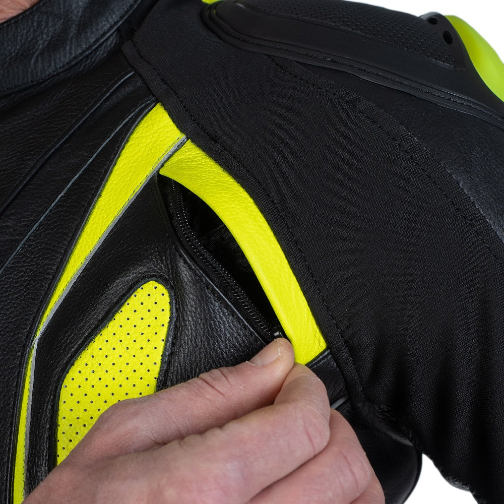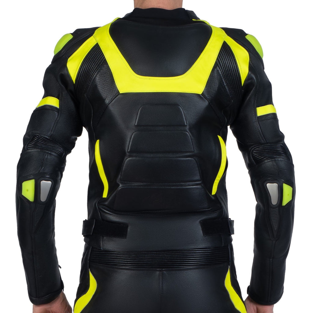 This cool racing jacket with a snug fit is made from premium full-grain leather with exceptional durability. Its partially perforated panels add to its comfort on the race track.