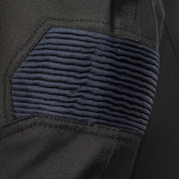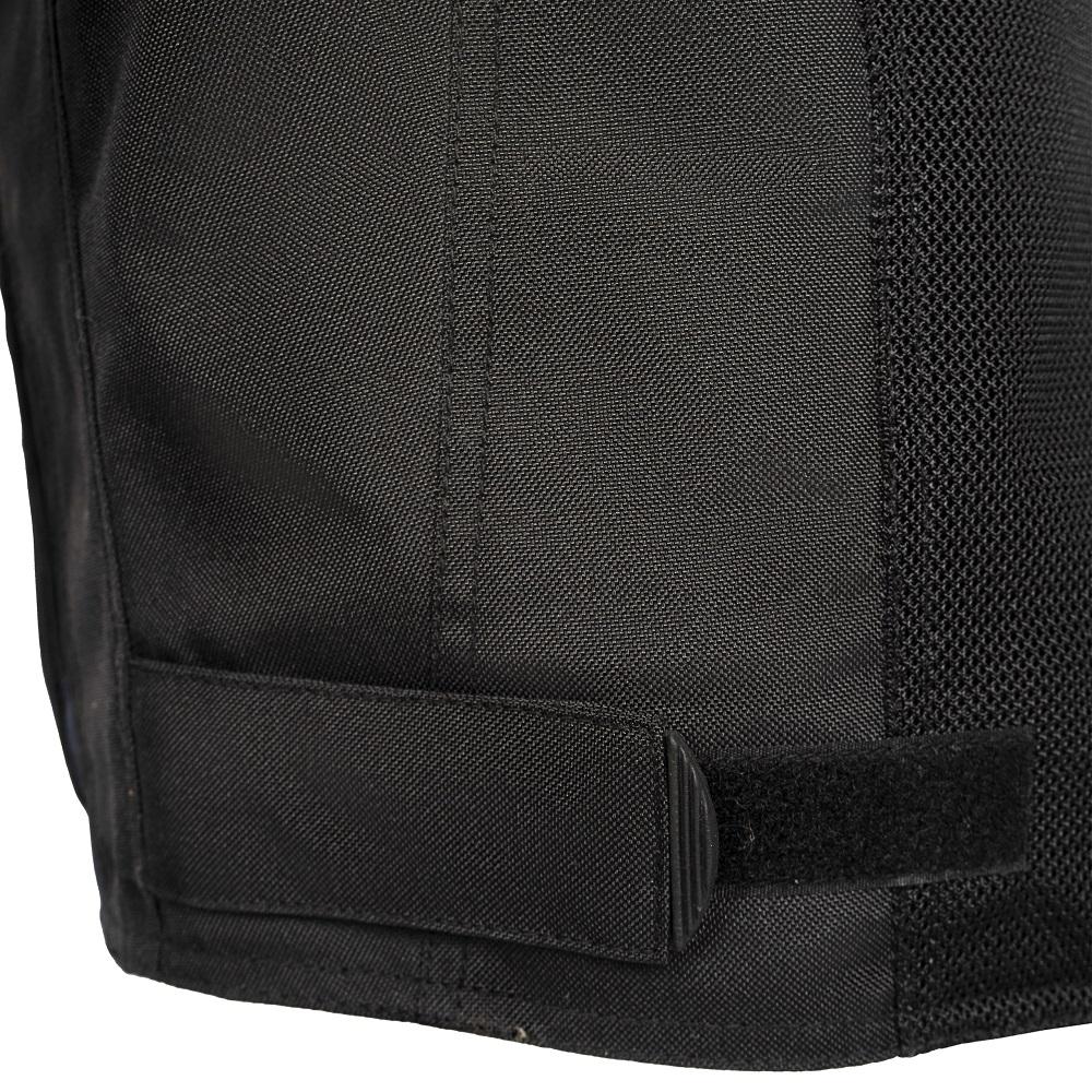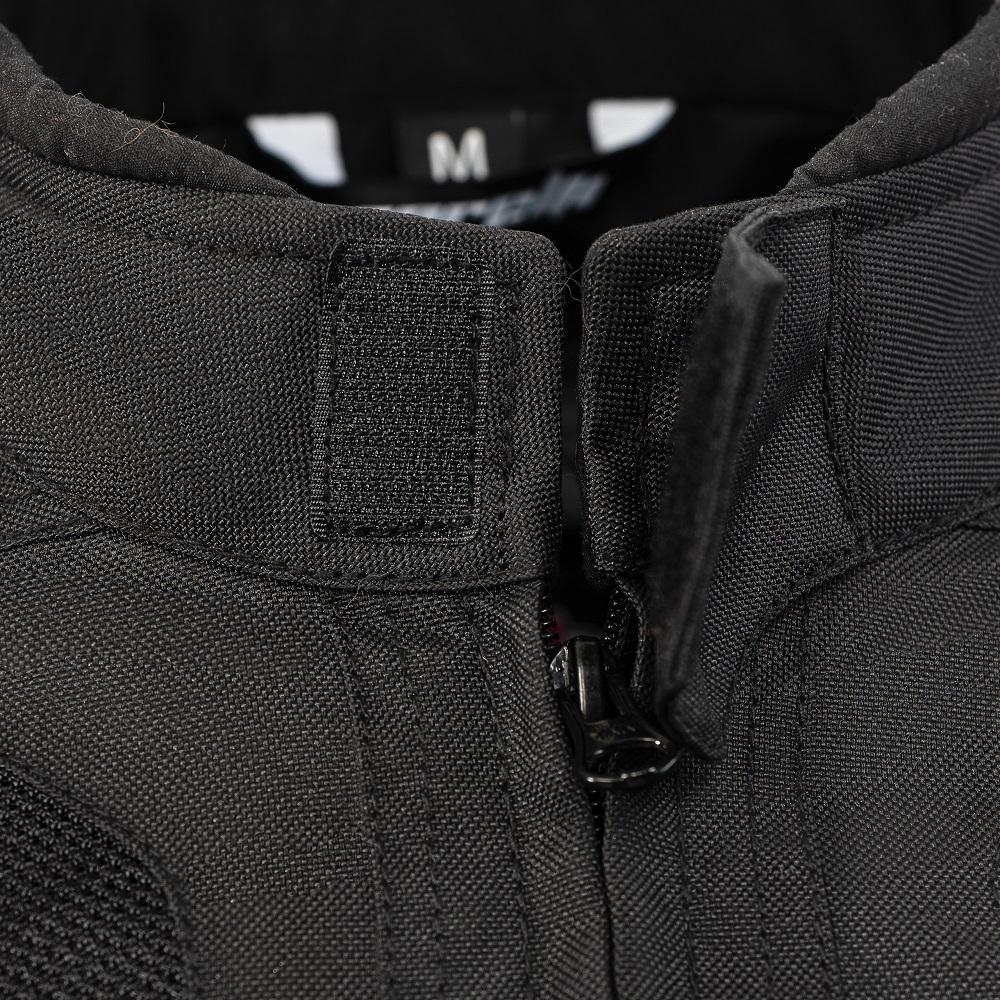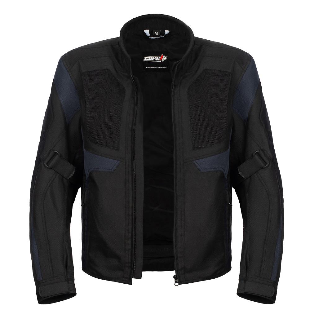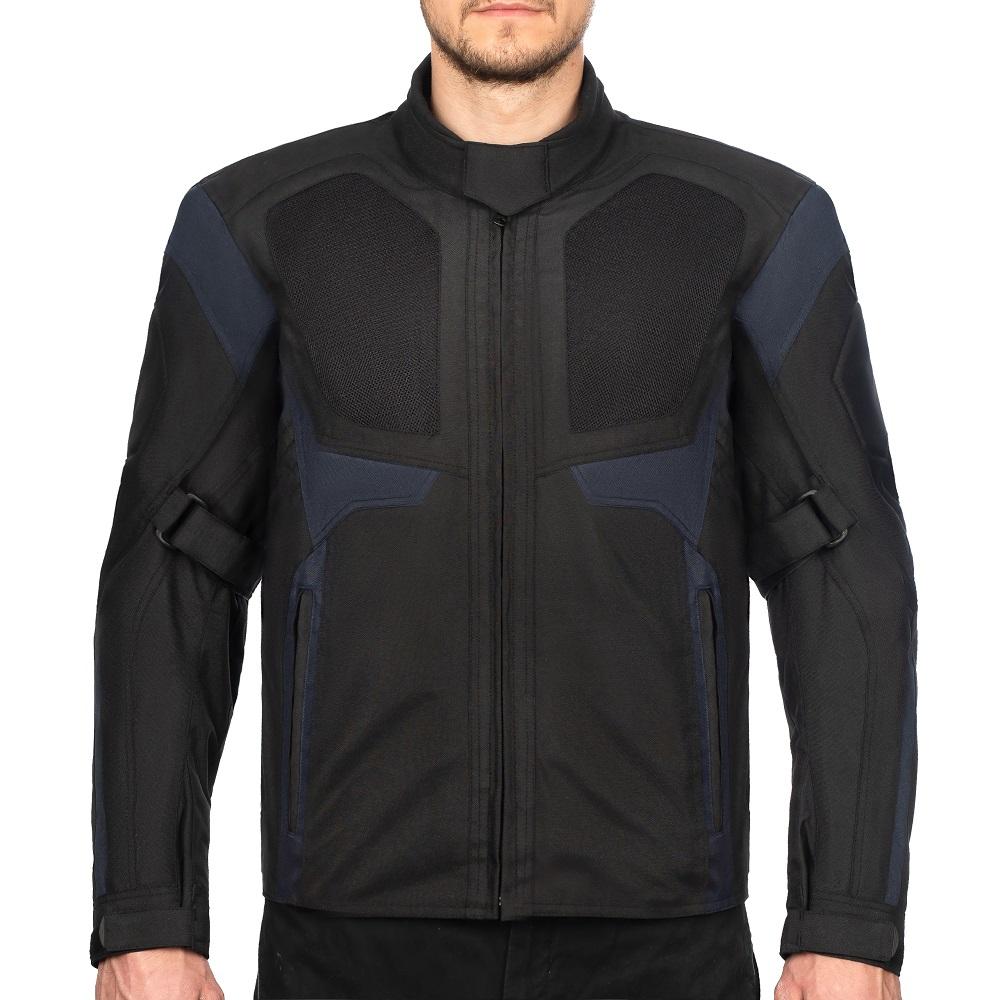 This fully-protected black with dark-blue panels lightweight textile jacket with a removable inner lining is perfect for all weather conditions! It has a perforated back and two perforated panels in the front for ventilation.Ā